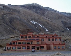 Opposite the monastery at Rongbuk, in the blasted valley, sits a hideous pink castellated monstrosity. According to what I could decipher from the Chinese plaque outside the front door, the hotel was built between 2002 and 2003 by a Shanghainese consortium. It is my opinion that not only was the place never actually finished, but that the Shanghai businessmen had never set foot in the place since, while the staff are having fun running it into the ground.