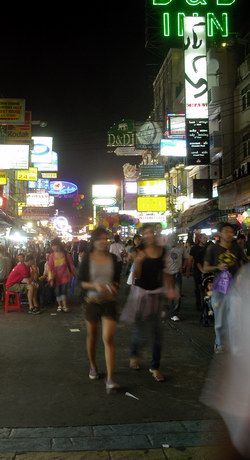 A lot of people come to south-east Asia to change their lives. Here, in beautiful surroundings and amongst welcoming people, it is possible to get away from one's former world - to alter oneself, either for just a little while, or in some cases, forever. Khao San road seems to have taken the desire for alteration literally. All down the overcrowded streets are services for change: get any bit of you pierced, get hair waxed off parts of your body, get hair added to your head, get your hair braided or stretched, get your skin inked: the queues at the tattoo parlours are out the door, and the plate glass windows offer glimpses of the clientelle receiving their alteration - one woman was having her boob done, which looked rather painful. Get your teeth or your skin whitened. There's at least one person walking around the street following a nose-job, and indeed the accomplished Thai plastic surgeons can even change your gender. Or you can turn yourself from an obnoxious sweaty German man wearing PVC trousers into an obnoxious sweaty German man wearing PVC trousers with a Thai prostitute on his arm. Thus in the spirit of alteration, in a moment of weakness, I found myself drawn into the aethos of change, and have succumbed to something I never thought I'd do. More on this radical alteration later.