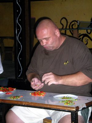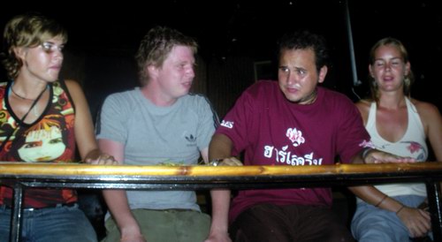 And then the same crowd organised a chilli eating competition - contestants had to match each other chilli for chilli, and the last to drop out won. Anyone who has eaten proper Thai chillis will know how much this would hurt. I ate one just to see, and I spent the next half hour with my tongue swollen up, sipping cold beer to take away the pain. The first to drop out was the guy who'd spent all day in winter clothing. "I've had a hard day," he said, after having munched 24 chillis. A Scottish guy dropped out at 26, while the winners were two Austrian girls who decided mutually to quit after 30. Then up stepped 'Big John', a huge English bloke with a broken nose, who said he'd eat the aggregate of all the competitors' score, plus one so that he'd beat them all. He wolfed them down in huge handfuls, and achieved his goal. I haven't seen him since.