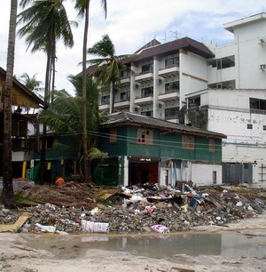 On our way back the rains started up again, so we ran and sheltered in a nearby restaurant, and ordered coffee. The restaurant is an open two-storey, barn-like structure with a corrugated iron roof, that thumped and banged in the rain and the wind. High up on one of the vertical wooden pillars supporting the roof was a piece of red tape. It said "10.20am December 26 2004". This was the level the water got to in the restaurant - 2.8 metres. We got talking to the proprietress, who said she had been in her room on the ground floor when it struck. "I was under," she said, "I was very shocked". As the water hit the wall by her bed, a plank of wood smashed through the wall, and with it came the wave. "And this chair," she motioned to the rustic wooden chair on which she was sitting, "and bodies". Luckily there was an upstairs, and she and her husband survived. When the waters receded there was a one-metre depth of silt, corpses and garbage in her room. We asked what assistance she had received from the government. "Nothing," she replied. "Volunteers come to me and ask if I need help. They help repair the wall. We fixed the roof. But now it is very noisy. Before there were many buildings around us to protect us from the wind and rain. Now, we have no neighbours." The restaurant stands alone, surrounded by rubble.