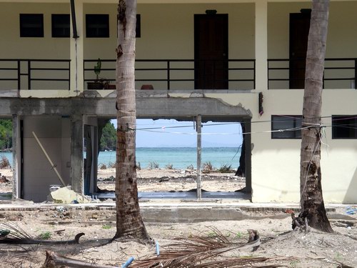 After showering, we took a hike over to the other side of the town. This was where we realised that our initial assessment of the damage inflicted on the place had been grossly underestimated. And later I learned that my initial charitable view of the government was misguided. Tonsai bay, where we arrived, is on the Andaman Sea side of the island. The other bay, over the sand, is on the Indian Ocean, and is, there's no other word for it, shagged. A few brick buildings remain, walls smashed out by the wave, but the rest is just a wasteland of debris-filled sand and the stumps of broken trees.