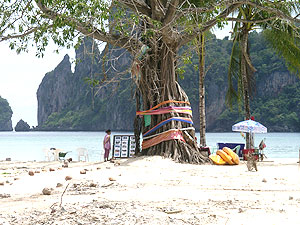 Generally I awake at 9, shower, dress, and walk from the air conditioning into the blasting heat outside our green-roofed bungalow, which is one of many clustered round a small swimming pool in the middle of what used to be a tree-dotted lawn. The space is now sand, the topsoil having been stripped off, and indeed some of the bungalows further from the beach - the ones that didn't have to be completely rebuilt - have a high-water mark just visible on the wallpaper, about a metre and a half from the floor. I then tramp about a kilometre from our bungalow into the village for breakfast somewhere - perhaps at Phi Phi Bakery, The Monsoon's Dream, or JJ's Pub, all of which provide similar western fare - then get to the office by 10.