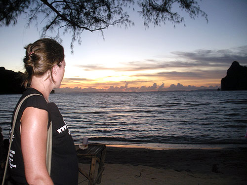 The phantom wave was meant to be arriving at 2am, and a few volunteers, talking about the panic, admitted that even though they knew it was a false alarm, they might not sleep well until after 2 - and I was among them. So what better for us to do in the face of a rumoured impending tsunami than go to a makeshift bar on the beach that was worst hit during the disaster? We sat and chatted, but most people were keeping half an eye on the moonlit waters to make sure they weren't being sucked out of the bay. Someone got a guitar, so we played and sang songs until about three, and everyone relaxed. We were then dangerously in the mood for more fun, so we ended up at Hippies Bar again, which it turns out is open 24 hours a day, and we sat by the beach drinking beer, and watched the dawn come up over the jungle-clad hills, which was stunning, before retiring to bed at 6. That's 6 AM, mind.