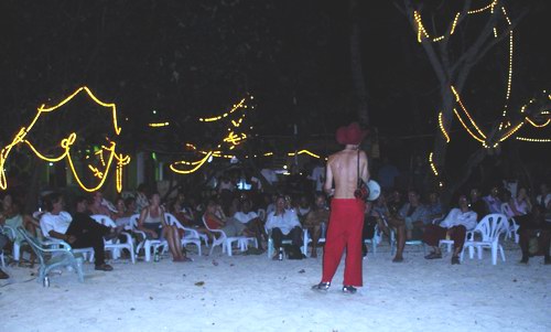 M meanwhile tends to do a variety of outdoor volunteering in the morning - clearing rubbish, helping to dig the memorial garden - then spends the afternoon by the pool, and waitresses at night. If she's not waitressing, we go for a bite to eat, then a couple of drinks. And invariably (at least for the past six days) we end up at Hippies Bar and catch the fire twirling show, which finishes at midnight.