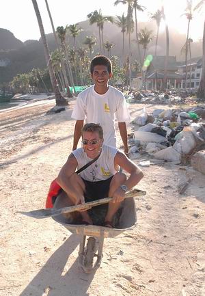 Our last day was spent in typically surreal Phi Phi style: the national Japanese broadcaster, NHK, had been on the island for a week making a documentary, and they were doing a live satellite broadcast, so a few of us were asked to come down to the beach to pretend to be clearing up.