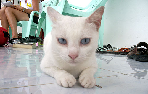 Finally, we have a cat who has adopted us, and sleeps outside our bungalow every day. A beautiful white, with a striped tail, and the bluest eyes I've ever seen on a living creature, as well as the highest-pitched miaow. We initially called her Blue Eyes, but then one evening we came home and there she was, and M said "Blue Eyes is back", so now she's called Frankie.