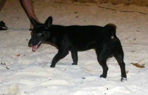 Then there's Taz. A black, rat-like dog with the face of Anubis. Taz is a big wimp - the other day a kitten jumped out at him and he ran a mile - but he loves being near people. Whenever there's a gathering of any size, there he is. One day we left our bungalow at 6.50 for the 7pm meeting, and outside the door there was Taz, who marched along in front of us the whole way, occasionally turning to check we were still there and hurry us up. Whether it's the fire show at Hippies, or a barbecue at Sunset Bar on the other side of the peninsula, you can guarantee Taz will be there.
