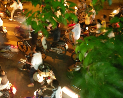 But what was sad was the deterioration of the place. Still listed in the guidebook, it no longer bustled. We were the only diners. There was no sign of Mrs Lac. The walls, in my memory dark wood, were painted an unfortunate hospital green, and decorated in the misguided "backpacker graffiti" style favoured by a lot of places, making the restaurant resemble a public toilet. The midget waiter was still there, but as we ordered he (or she - I could never tell) started the hard-sell on various coins and bracelets, and as we waited for our food on the balcony overlooking what used to be a quiet alleyway, but was now a teeming throng of thousands of motos, a series of hawkers and touts came upstairs, presumably with the permission of Mr Lac, and got in our faces, failing to sell us a thing. The food was good and the beer cold, but there was a desolation about it that saddened me.