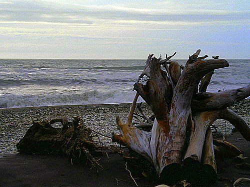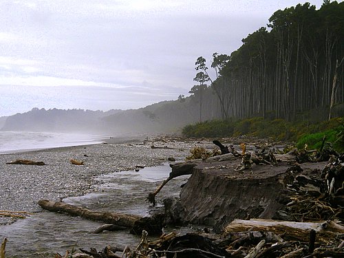 We spent an uneventful night there, enjoying listening to a pub quiz in the local Irish pub, though we were too late to enter it. The next day we headed through more stunning valleys and past gorgeous lakes. We hit the west coast and the Tasman Sea, last viewed from the boat in Milford Sound. The vegetation was very different here - dense scrub blown into wind-scraped shapes, with ancient looking trees sticking out of it. I can only imagine the nightmare the first European settlers, as well as the Maoris, must have had trying to negotiate the woods round here. The sea crashed up a beach, making a fine mist through the trees. It was stunning.