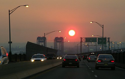 On the way back to the hotel we did cliché #3 or more and had a slice of sublime pizza, then I succumbed to the retail lure and bought the speakers. We took a limo to Newark airport with yet another insane driver - something that has been a theme of this journey - a middle-aged Venezuelan man who started taking pictures of the pollution-beautified sunset over New Jersey with his camera-phone while driving at breakneck speed in the fast lane, and then put on a CD of Japanese pop music, tremendously loud, and started dancing in the driver's seat. We sat in the back doubled up in mirth - a perfect end to our flying New York visit.